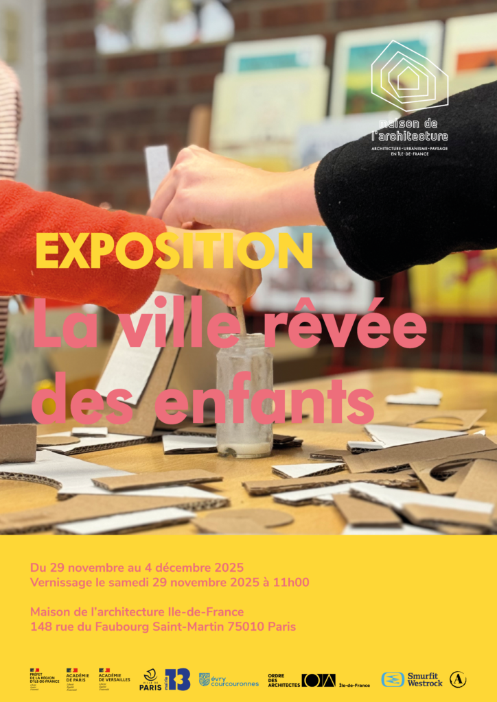 Exposition Ville rêvée des enfants à la Maison de l’architecture Ile-de-France Exposition du samedi 29 novembre au jeudi 4 décembre 2025 Tous les jours de 10h à 18h, et le lundi de 10h à 17h.